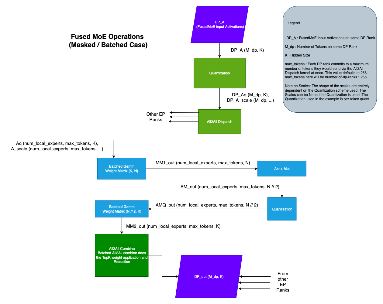 • In the Batched variant, the All2All Dispatch returns the activations as a tensor of shape (num_experts, max_tokens, K). Here, the activations/tokens that subscribe to the same expert are batched together. Note that not all entries of the tensor are valid. The activations tensor is typically accompanied by an expert_num_tokens tensor of size num_experts, where expert_num_tokens[i] indicates the number of valid tokens that subscribe to the ith expert. Look at PplxPrepareAndFinalize or DeepEPLLPrepareAndFinalize for an example.